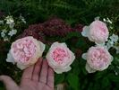 Shrub. English Rose Collection. Blush, cream edges, ages to white . Moderate, opinions vary fragrance. Medium to large, very full (41+ petals), borne mostly solitary, cluster-flowered, in small clusters, cupped, rosette bloom form. Blooms in flushes throughout the season. USDA zone 5b through 10b. Height of 3' to 5' (90 to 150 cm). Width of 30" to 4' (75 to 120 cm). David C. H. Austin (1926-2018) (1989).