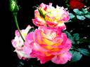 Hybrid Tea. Salmon-pink, pink edges, golden-yellow . Moderate, myrrh fragrance. Very large, very full (41+ petals), borne mostly solitary, exhibition bloom form. Blooms in flushes throughout the season. USDA zone 7b and warmer. Height: 4' to 6' (120 to 185cm). Peter Ping Lim :林 彬 (1991), Jerry F. Twomey (1991).