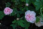Damask Perpetual, Hybrid Spinosissima. White, light pink shading. [Light pink.]. Moderate fragrance. Medium to large, very full (41+ petals), flat bloom form. Occasional repeat later in the season. USDA zone 3b through 9b. Height of 6' to 8' (185 to 245 cm). James Lee (1821).