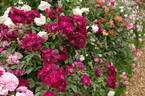 Floribunda. Deep purple with lighter reverse, dark burgundy red stamens and anthers. Full (26-40 petals), cluster-flowered, in small clusters, cupped-to-flat bloom form. Blooms in flushes throughout the season. USDA zone 6b through 9b (default). Height: 30" to 35" (75 to 90cm). Width: 31" to 39" (80 to 100cm). Edgar Norman Swane (1998).