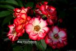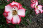 Floribunda. Red and white, red edges, lemon-yellow stamens. Strong, fruity fragrance. Medium to large, semi-double (9-16 petals), cluster-flowered, in small clusters bloom form. Prolific, blooms in flushes throughout the season. USDA zone 6b through 10b. Height of 3' to 5' (90 to 150 cm). Width of 3' to 4' (90 to 120 cm). Tom Carruth (1999).