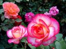 Floribunda / Cluster Flowered. Pink and white, red edges, yellow center. None to mild fragrance. Very large, very double, borne mostly solitary, in small clusters, high-centered bloom form. Blooms in flushes throughout the season. USDA zone 6b through 9b (default). Height of 2' to 39" (60 to 100 cm). Width of 20" to 2' (50 to 60 cm). Michel Adam (2005).