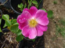 Hybrid Wichurana, Rambler.  Rose-pink, white center, yellow stamens.  None to mild fragrance.  Medium, single to semi-double, in large clusters, open bloom form.  Once-blooming spring or summer.  USDA zone 4b through 9b.