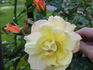 Climber, Large-Flowered Climber. Apricot - yellow, ages to light yellow . Flower: copper yellow, lighter when fading and with a touch of pink. Strong, fruity, spice fragrance. Medium, semi-double to double, cluster-flowered, in small clusters, cupped-to-flat, reflexed, rounded bloom form. Blooms in flushes throughout the season. USDA zone 5b and warmer. Height of 8' to 8' 2" (245 to 250 cm). Width of 38" to 39" (95 to 100 cm). Tim Hermann Kordes (1995).