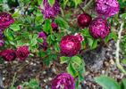 Gallica / Provins. Violet - purple, white undertones, brown shading. Small, very double, in small clusters, button-eye, flat, rosette bloom form. Once-blooming spring or summer. USDA zone 4b through 8b. Height of 47" to 4' 11" (120 to 150 cm). Lecomte (1828).