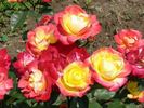 Floribunda. Red and golden-yellow, ages to carmine-red . Mild fragrance. Medium, semi-double to double, in small clusters, flat bloom form. Blooms in flushes throughout the season. USDA zone 6b through 9b (default). Height of 39" to 4' 1" (100 to 125 cm). Patrick Dickson (1926-2012) (1963).