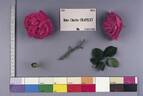 Hybrid Perpetual.  Purple - red, red shading.  Large, full (26-40 petals), cluster-flowered, cupped bloom form.  Blooms in flushes throughout the season.  USDA zone 6b through 9b (default).   Louis-Xavier Granger (1857), Pierre-Hubert Portemer père (1857).