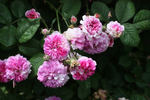 Polyantha. Carmine-pink, ages to light pink . Small, semi-double (9-16 petals), in large clusters bloom form. Occasional repeat later in the season. USDA zone 6b through 9b (default). Hermann Kiese (1896).
