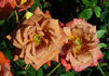 Mini-Flora. Brown - orange, darker shading, yellow reverse. Flowers brown-orange blushing dark orange, reverse butterscotch yellow. Mild fragrance. Medium, full (26-40 petals), cluster-flowered, in small clusters, high-centered bloom form. Blooms in flushes throughout the season. Christian Bédard (2009).