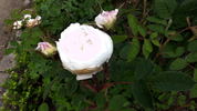 Bourbon, Hybrid Noisette. White, light pink reverse. Medium to large, full (26-40 petals), cupped-to-flat, scalloped bloom form. Blooms in flushes throughout the season. USDA zone 7b and warmer. Joseph Schwartz (1885).