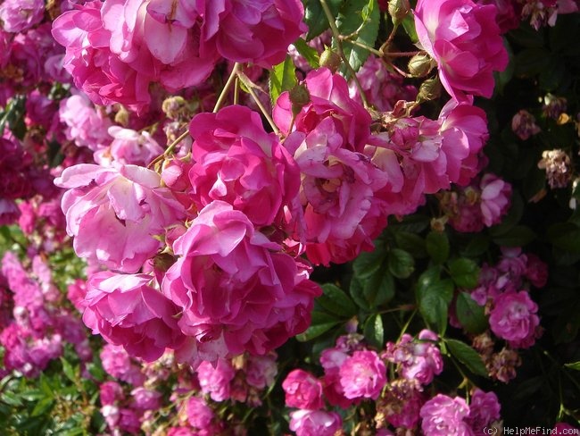 Crimson and purple. Strong, linden fragrance. 10 to 20 petals. Average diameter 1.25". Small, cluster-flowered bloom form. Spring or summer flush with scattered later bloom. Small buds.