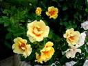 Floribunda, Hybrid Hulthemia persica, Shrub.  Light yellow, red flecks, orange shading, ages to cream .  Mild fragrance.  Medium, single (4-8 petals), borne mostly solitary, in small clusters bloom form.  Blooms in flushes throughout the season.