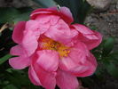 Hybrid Lutea, Hybrid suffruticosa, Tree peony. Carmine-pink, yellow blending, apricot shading, golden-yellow center.. Purple flares. Large, single to semi-double bloom form. USDA zone 2a and warmer. Louis Henry (1907).
