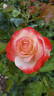 Grandiflora.  Cream, coral edges.  Flowers creamy white, edged coral-orange.  Moderate fragrance.  Medium to large, very double, borne mostly solitary, in small clusters, cupped bloom form.  Blooms in flushes throughout the season.  Height: 3' to 5' (90 to 150cm).   Christian Bédard (2010).