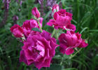 Floribunda. Mauve. Flowers reddish-purple. Strong fragrance. Large, full (26-40 petals), in small clusters, flat, ruffled bloom form. Blooms in flushes throughout the season. USDA zone 6b and warmer. Height: 30" to 5' (75 to 150cm). William A. Warriner (1981).