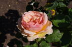 Grandiflora, Hybrid Tea. Light pink, peach shading. Strong fragrance. Very large, very full (41+ petals), borne mostly solitary, in small clusters, button-eye, old-fashioned bloom form. Blooms in flushes throughout the season. Height of 31" to 39" (80 to 100 cm). Alain Meilland (1940-....) (2010).