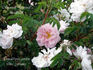 Damask Perpetual, Hybrid Spinosissima. White, light pink shading. [Light pink.]. Moderate fragrance. Medium to large, very full (41+ petals), flat bloom form. Occasional repeat later in the season. USDA zone 3b through 9b. Height of 6' to 8' (185 to 245 cm). James Lee (1821).