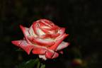 Grandiflora. Scarlet, white reverse. None / no, rose, opinions vary fragrance. Large, full (26-40 petals), borne mostly solitary, cluster-flowered, in small clusters, high-centered, reflexed bloom form. Continuous (perpetual) bloom throughout the season. USDA zone 6b through 9b (default). William A. Warriner (1977).