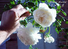 Shrub. (Series: English Rose Collection) White. Strong, myrrh, vanilla fragrance. Large, very full (41+ petals), in small clusters, globular, quartered bloom form. Blooms in flushes throughout the season. USDA zone 5b through 11. Height: 47" to 11'10" (120 to 360cm). Width: up to 39" (up to 100cm). David C. H. Austin (1926-2018) (2007).
