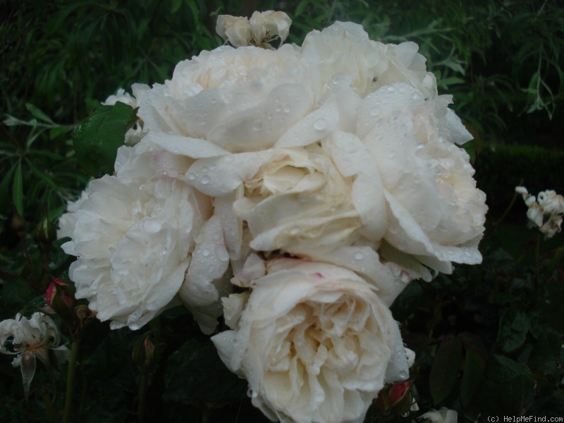 White or white blend. Flowers white, with a tendency to revert to pink. Moderate, sweet fragrance. 80 to 85 petals. Average diameter 2.25". Medium, very full (41+ petals), cluster-flowered, in small clusters, cupped, old-fashioned, rounded bloom form. Prolific, blooms in flushes throughout the season. Rounded buds.