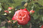 Floribunda. Orange-pink. Light rose-salmon. Mild fragrance. Large, full (26-40 petals), in small clusters bloom form. Blooms in flushes throughout the season. USDA zone 6b and warmer. Height of up to 4' 1" (up to 125 cm). Samuel Darragh (1932-2019) McGredy IV (1969).