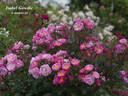 Floribunda, Patio, Polyantha. Violet - purple. Moderate fragrance. Small, double (17-25 petals), cluster-flowered, in large clusters, cupped-to-flat bloom form. Blooms in flushes throughout the season. USDA zone 6b and warmer. Height of 15" to 4½' (40 to 135 cm). Width of 3' (90 cm). Harkness & Co. (1984).