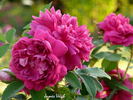 Hybrid Perpetual, Moss. Violet, red shading. Mild fragrance. Medium to large, full (26-40 petals), in small clusters bloom form. Spring or summer flush with scattered later bloom. USDA zone 6b through 9b (default). Height of 2' to 42" (60 to 105 cm). Width of up to 3' (up to 90 cm). Eugène Verdier fils aîne (1864).
