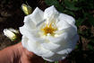 Climber. White, light yellow undertones. Large, semi-double to double bloom form. Louis Lens (1924-2001) (1980).