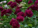 Shrub.  English Rose Collection.  Crimson, ages to purple .  Strong, old rose fragrance.  Large, very full (41+ petals), borne mostly solitary, in small clusters, cupped, quartered bloom form.  Blooms in flushes throughout the season.  USDA zone 5b through 9b.  Height of 41" to 4'  (105 to 120 cm).  Width of 3'  (90 cm). David C. H. Austin (1926-2018) (1994).