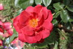 Hybrid Tea. Coral-red, ages to geranium-red . Strong, citrus, damask, fruity, spice fragrance. Very large, full (26-40 petals), borne mostly solitary, in small clusters, high-centered bloom form. Prolific, blooms in flushes throughout the season. USDA zone 7b through 10b. Height of 30" to 5' (75 to 150 cm). Width of 2' (60 cm). Mathias Tantau, Jr. (1912 - 2006) (1963).