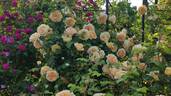 Noisette, Tea Noisette. Cream, light pink shading, salmon-yellow highlights. Mild to strong fragrance. Large, very double, globular bloom form. Continuous (perpetual) bloom throughout the season. USDA zone 6a through 10b. Height: 8' to 25' (245 to 760cm). Width: 10' (305cm). Joseph Schwartz (1875).
