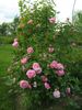 Climber, Hybrid Tea, Cl., Large-Flowered Climber. Rose-pink, darker reverse. Strong, apple fragrance. Large, very full (41+ petals), cluster-flowered, in small clusters, cupped, old-fashioned, quartered bloom form. Blooms in flushes throughout the season. USDA zone 5b through 9b. Height of 8' to 10' (245 to 305 cm). Width of 4' to 8' (120 to 245 cm). Eugene S. Boerner (1949).