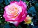 Hybrid Tea. Salmon-pink, pink edges, golden-yellow . Moderate, myrrh fragrance. Very large, very full (41+ petals), borne mostly solitary, exhibition bloom form. Blooms in flushes throughout the season. USDA zone 7b and warmer. Height: 4' to 6' (120 to 185cm). Peter Ping Lim :林 彬 (1991), Jerry F. Twomey (1991).