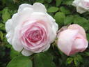 Shrub. English Rose Collection. Blush, cream edges, ages to white . Moderate, opinions vary fragrance. Medium to large, very full (41+ petals), borne mostly solitary, cluster-flowered, in small clusters, cupped, rosette bloom form. Blooms in flushes throughout the season. USDA zone 5b through 10b. Height of 3' to 5' (90 to 150 cm). Width of 30" to 4' (75 to 120 cm). David C. H. Austin (1926-2018) (1989).